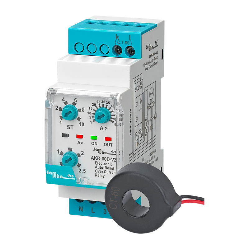 AKR-60D-V2 Auto-Reset Overcurrent Protection Relay with built-in CT is designed to detect overcurrent conditions and protect motors and electrical equipment from overload faults. With an adjustable current range of 1-63A, it provides accurate monitoring and reliable protection. It is widely used in motors, pumps, fans, and industrial automation systems.