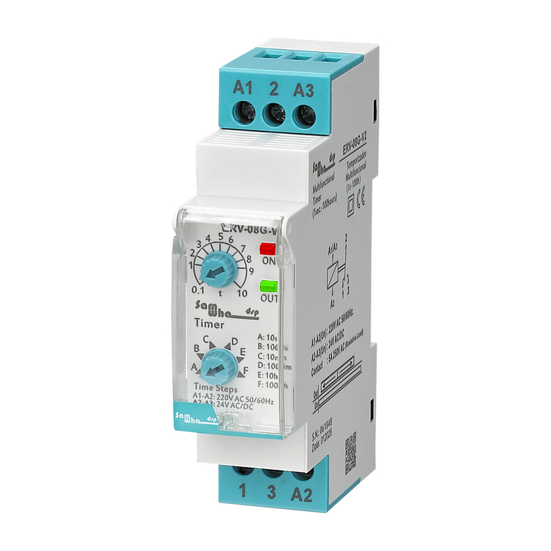 ERV-08G-V2 power on timing multifunctional timer are designed for precise time control in industrial automation systems. With adjustable time settings and DIN rail mounting, they are widely used in motors, pumps, fans and control panels.